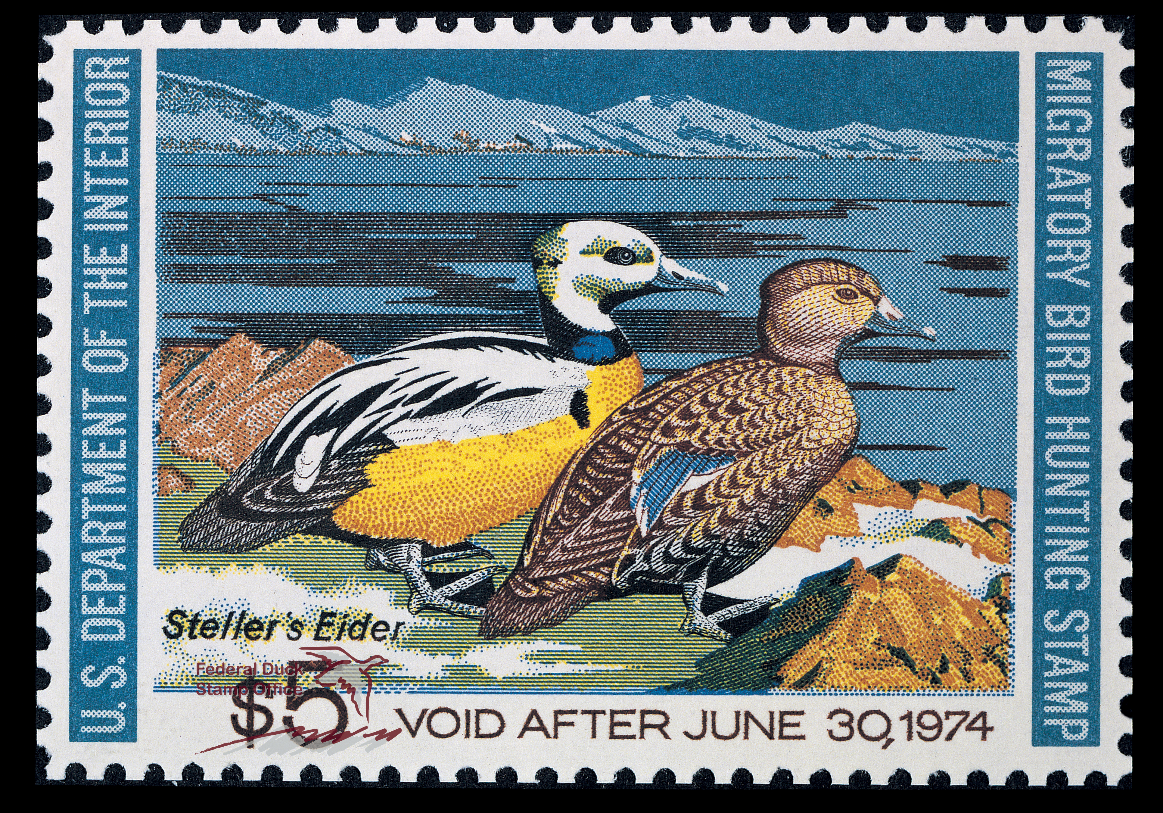 Inscription: Front - "U.S. Department of the Interior. Void after June 30, 1974. Migratory Bird Hunting Stamp. $5. Steller's Eider." Back - "Buy Duck Stamps. Save wetlands. Send in all bird bands. Sign your Duck Stamp. It is unlawful to hunt waterfowl unless you sign your name in ink on the face of this stamp."