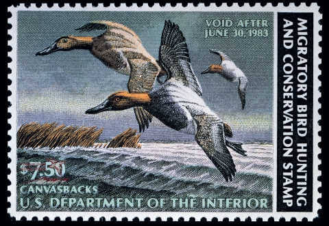 Inscription: Front - "U.S. Department of the Interior. Void after June 30, 1983. Migratory Bird Hunting and Conservation Stamp. $7.50. Canvasbacks." Back - "Buy Duck Stamps. Save wetlands. Send in all bird bands. Sign your Duck Stamp. It is unlawful to hunt waterfowl unless you sign your name in ink on the face of this stamp."