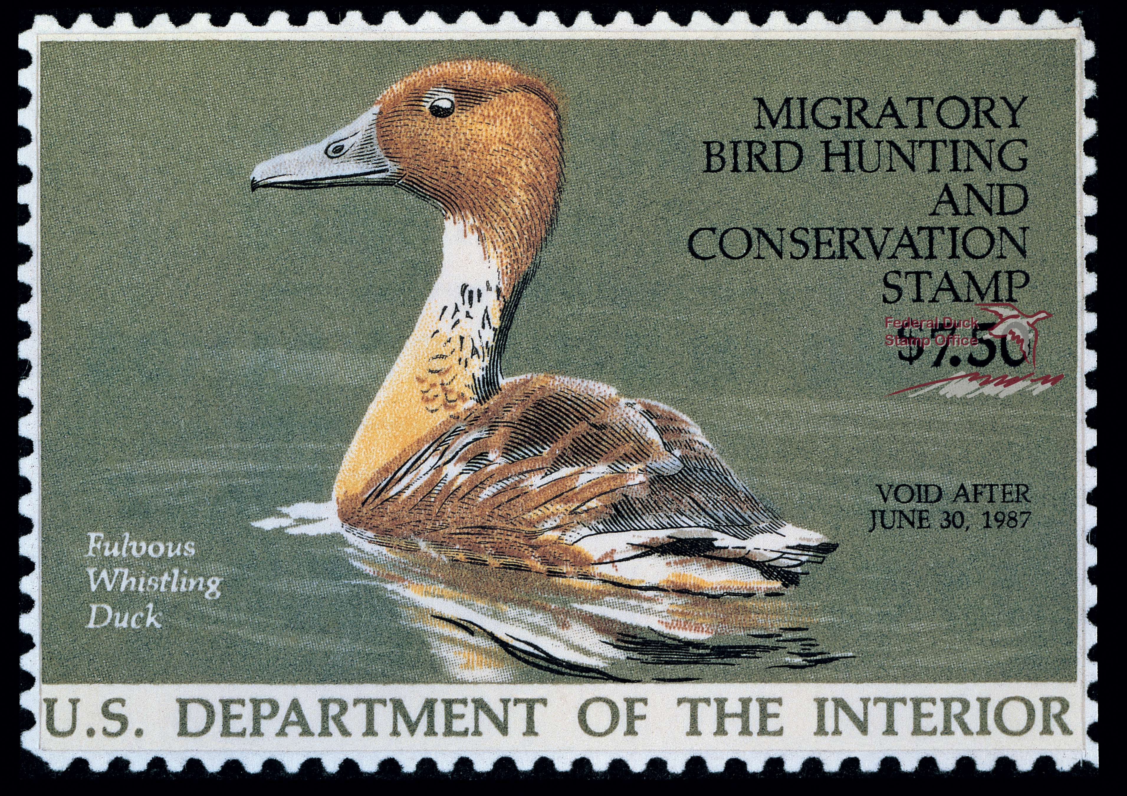 Inscription: Front - "U.S. Department of the Interior. Void after June 30, 1987. Migratory Bird Hunting and Conservation Stamp. $7.50 Fulvous Whistling Duck." Back - "Buy Duck Stamps. Save wetlands. Send in all bird bands. Sign your Duck Stamp. It is unlawful to hunt waterfowl unless you sign your name in ink on the face of this stamp."