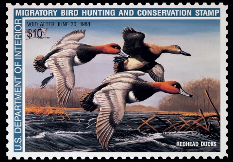 Inscription: Front - "U.S. Department of the Interior. Void after June 30, 1988. Migratory Bird Hunting and Conservation Stamp. $10. Redhead Ducks." Back - "Take Pride in America, Buy Duck Stamps, Save Wetlands. Send in all bird bands. Sign your Duck Stamp. It is unlawful to hunt waterfowl unless you sign your name in ink on the face of this stamp."
