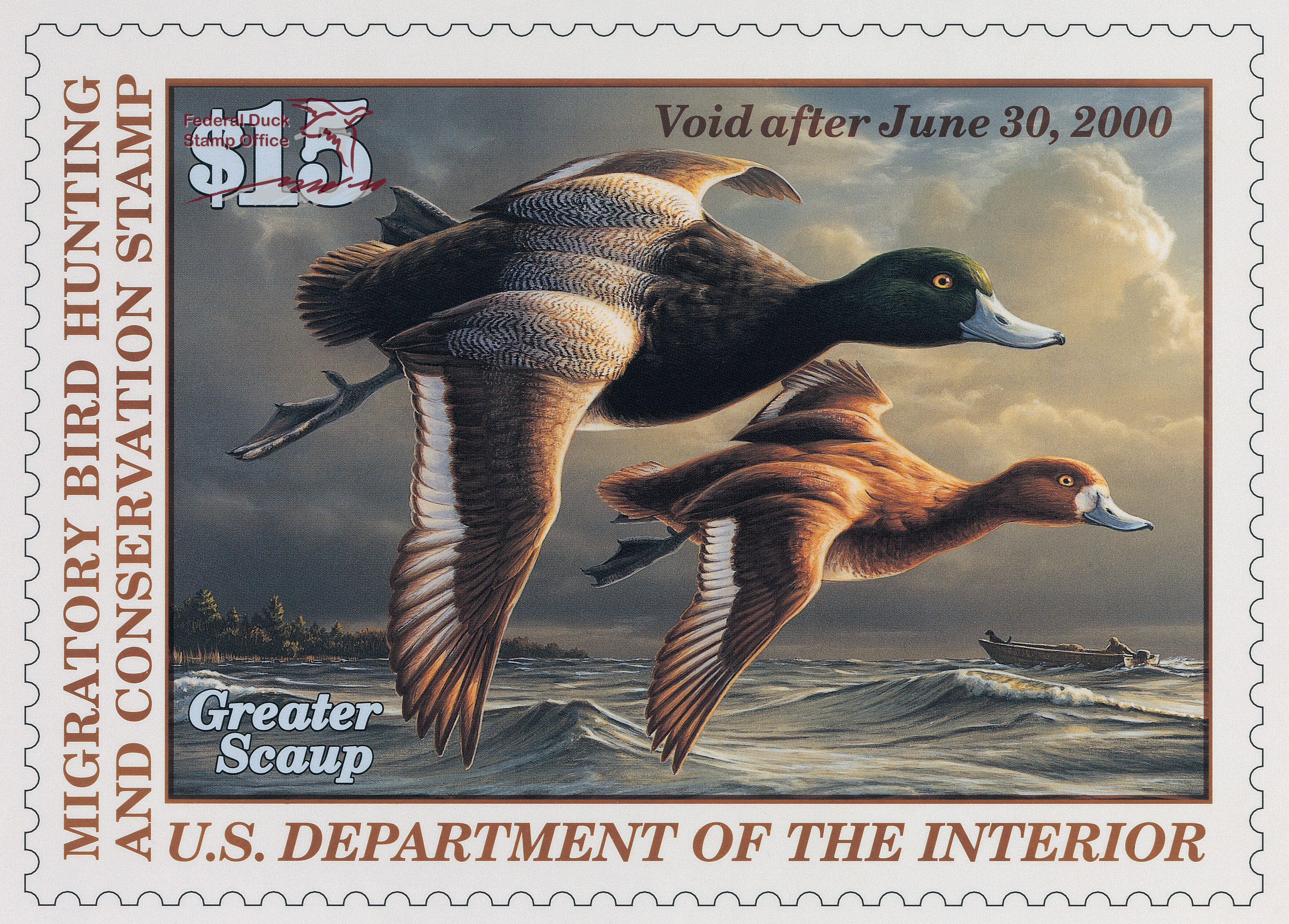 Inscription: Front - "U.S. Department of the Interior. Void after June 30, 2000. Migratory Bird Hunting and Conservation Stamp. $15. Barrow's Goldeneye." Back - "Invest in America's Future. Buy Duck Stamps. Save Wetlands. Send in or report all bird bands to 1-800-327-BAND. It is unlawful to hunt waterfowl or use this stamp as a pass to a National Wildlife Refuge unless you sign your name in ink on the face of this stamp." PSA Inscription: Front - "The U.S. Fish & Wildlife Service. The 1999-2000 Migratory Bird Hunting & Conservation Stamp. 98% of Federal Duck Stamp dollars purchase wetlands and other wildlife areas for the national wildlife Refuge System, saving habitat for many different kinds of birds & animals. Help conserve America's natural heritage. Do your part - Buy Duck Stamps! If applicable, sign, peel and attach to license. Peel here." Back - "Pocket Guide to the U.S. Fish & Wildlife Service. Fun Facts - Did you know that . . . you can use the Federal Duck Stamp to gain free admission to National Wildlife Refuges? - there is a Junior Duck Stamp art competition for school children K-12? - Duck Stamps are sold not only in most U.S. Post Offices, but in many commercial retail outlets across the country? Important. It is unlawful to hunt waterfowl or use this stamp as a pass to a National Wildlife Refuge unless you sign your name in ink on the face of the actual stamp. For hungting regulation please contact your State Department of Fish & Wildlife Agencies or Natural Resources. Migratory Game Bird Harvest Registration Call 1-800-WETLAND. Report all bird bands to 1-800-327-BAND. Federal Duck Stamp Office 1849 C Street NW, Suite 2058 Washington, DC 20240. Sales 1-888-534-0400. www.fws.gov/r9dso."