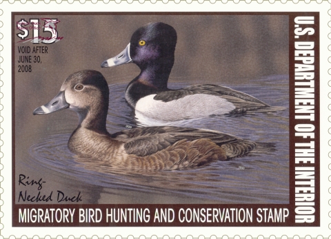 Inscription: Front - "U.S. Department of the Interior. Void after June 30, 2008. Migratory Bird Hunting and Conservation Stamp. $15. Ring-Necked Duck." back - Barcodes "333600" on four corners of pane. Federal Duck Stamp information on back of each stamp.