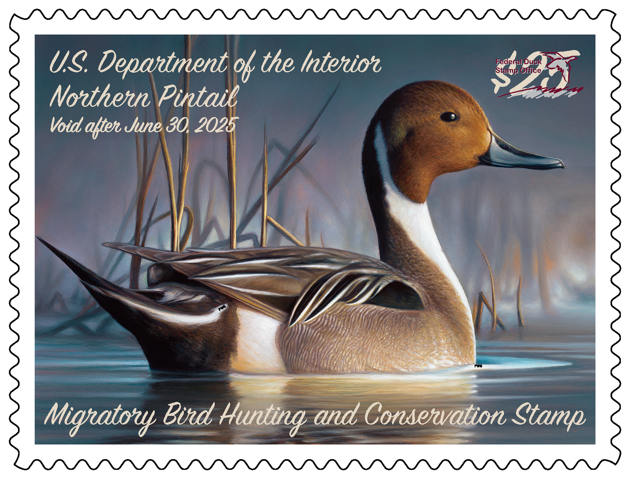 Marginal Markings: Selvage Text: U.S. Fish & Wildlife Service • 2024–2025 Migratory Bird Hunting and Conservation Stamp • Celebrating the 25th Anniversary of the Harvest Information Program • Informative text • Artist: Chuck Black, Northern Pintail © • If applicable, sign your stamp. Back: Verso-text • Ordering information • Barcode • U.S. Department of the Interior logo • U.S. Fish & Wildlife Service
