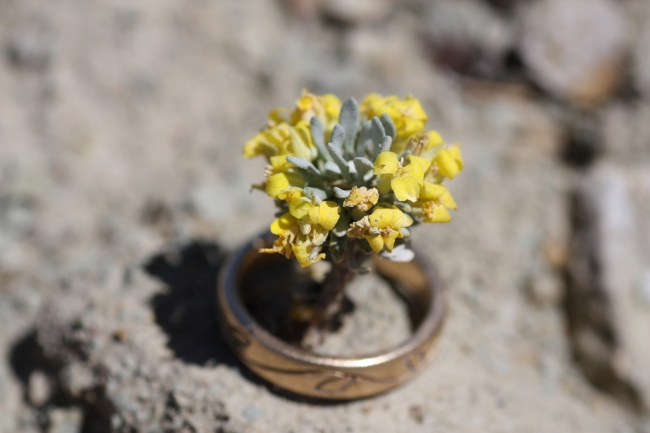 Both the Dudley Bluffs bladderpod (Physaria congesta or Lesquerella congesta) and the Dudley Bluffs twinpod (Physaria obcordata) are rare members of the Brassicaceae (mustard) family. Dudley Bluffs bladderpod is an extremely small cushion plant only 0.4 to 1.2 inches in diameter with a congested mass of bright yellow flowers and narrow silvery leaves rising from a long, thin taproot. The cushion growth habit is an adaptation to erosive badland soils, which has evolved independently in several unrelated taxa in this area. Flowering is typically during April and May, and fruit set from late May into June. Dudley Bluffs twinpod is 4.8 to 7.2 inches tall with oblanceolate, entire leaves 0.4 to 0.6 inches wide and 1.6 to 3.8 inches long, with a silvery sheen due to a dense covering of overlapping, dish-shaped trichomes. The species' scientific name refers to the hear-shaped silique or fruit. Flowers are yellow, and typically present in May and June. These two rare mustards grow on barren white outcrops exposed along drainages by erosion from downcutting of streams in the Picaence Basin in Rio Blanco County, Colorado. The bladderpod is the rarer of the two species; its entire range is limited to within 10 miles of the original type locality. The range of Dudley Bluffs twinpod is slightly broader, with some occurances separated by as much as 23 miles. While the twinpod grows on steep sideslopes, the bladderpod grows on the top and sides of level outcrops where the white shale is exposed.