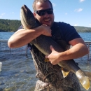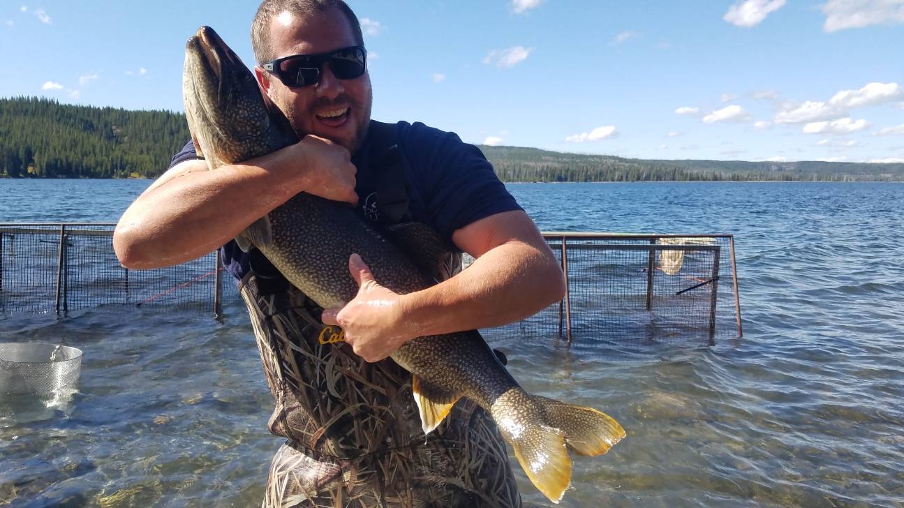 Dustin Casady hugging a lake trout at Yellowstone Lake