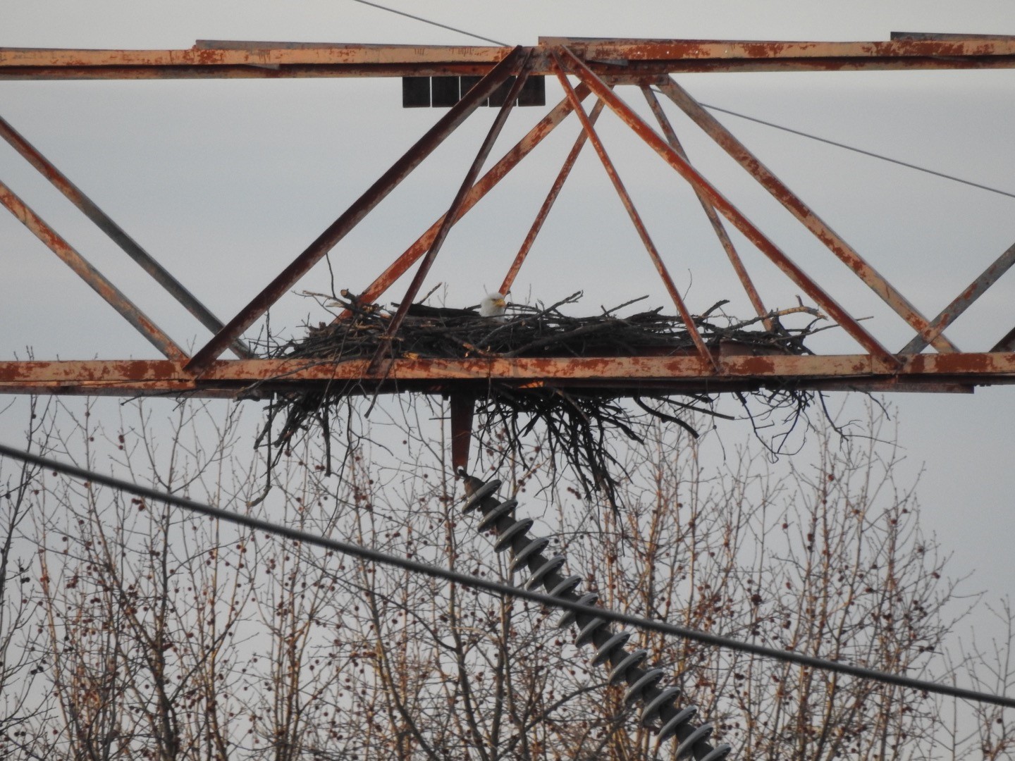 A female eagle sits in her nest built precariously on a transmission tower.