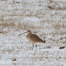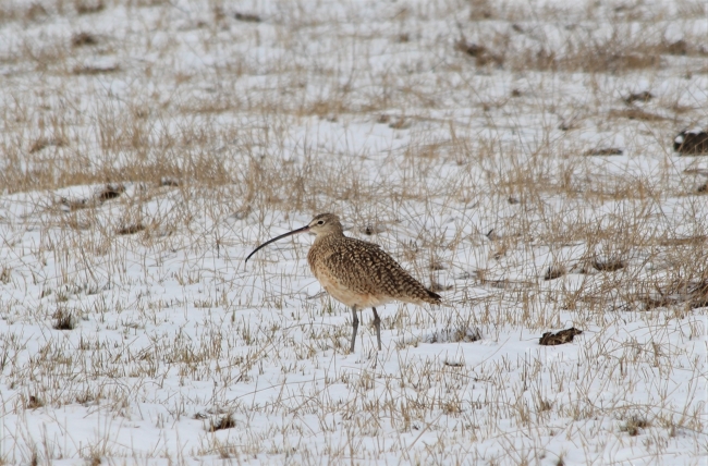 A long-billed curlew poses in a field of grass with a dusting of snow on an early spring day at Red Rock Lakes National Wildlife Refuge. Photo by Cortez Rohr/USFWS