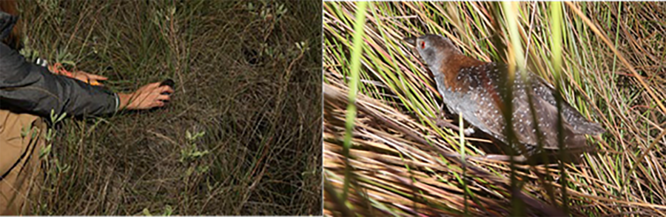 Figure 5. Using a “bander’s grip” someone is releasing a black rail by gently placing it on top of dense vegetative cover (left photo). A black rail released in this manner may walk (right photo) or make a short flight way from the release site before disappearing into cover- or disappear beneath plant cover immediately following release. Note the optional “above joint” placement of the band on this individual. Resumption of capture activities following a release should be planned to avoid disturbance to the release site. Images: USFWS, W. Woodrow
