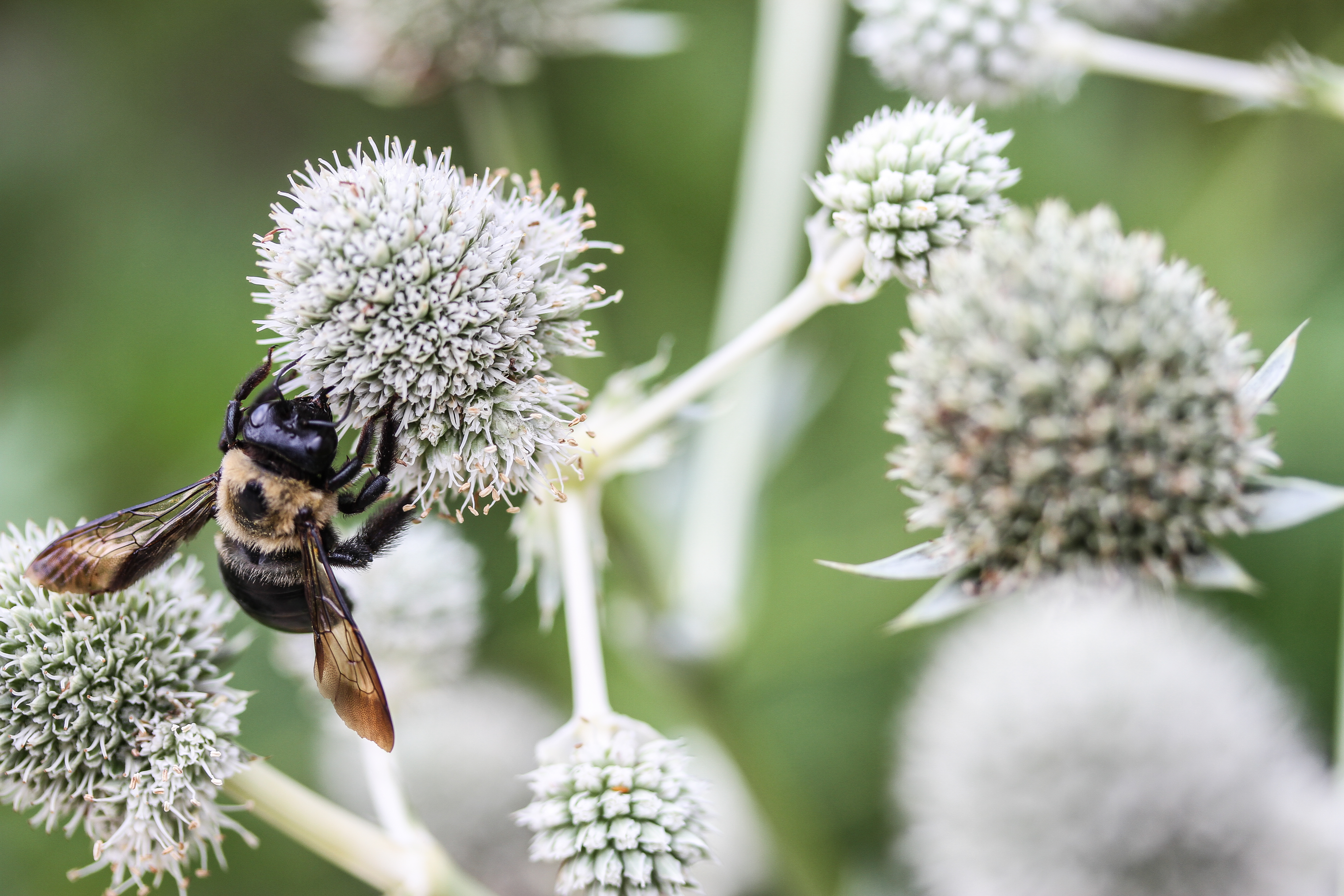 An eastern carpenter bee on a rattlesnake master at the Asheville Field Office pollinator garden.