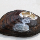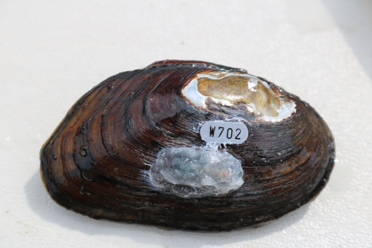 An Eastern elliptio (Elliptio complanata) tagged with both a PIT tag and Hallprint tag. The Hallprint tag can be used to identify the mussel if the PIT tag reader is either not available or not functioning properly. Photo: Matthew Patterson, USFWS.
