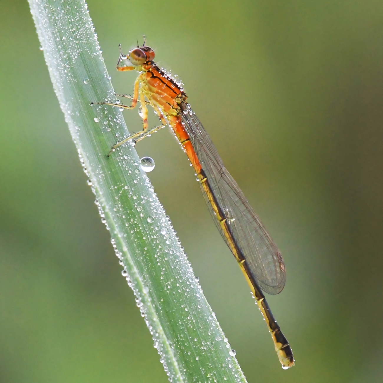 The Eastern Forktail is the most widespread and well-known of the genus. The male is tiny, with a green and black striped thorax and a black abdomen with a bright blue tip. Young females are bright orange, becoming bluish gray with maturity. This species is often the first damselfly to appear in the spring.