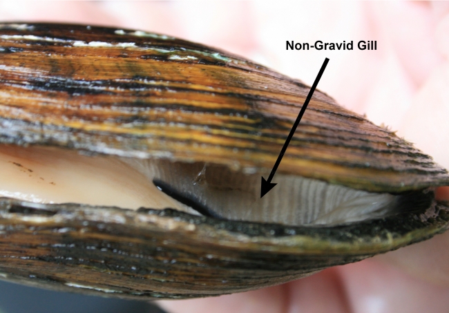 The Eastern lampmussel (Lampsilis radiata) gently pried open to reveal the gills and check for gravidity. The flattened gills in this female indicate it is not gravid. Photo: Matthew Patterson, USFWS. Graphics: Kristin Simanek, USFWS.