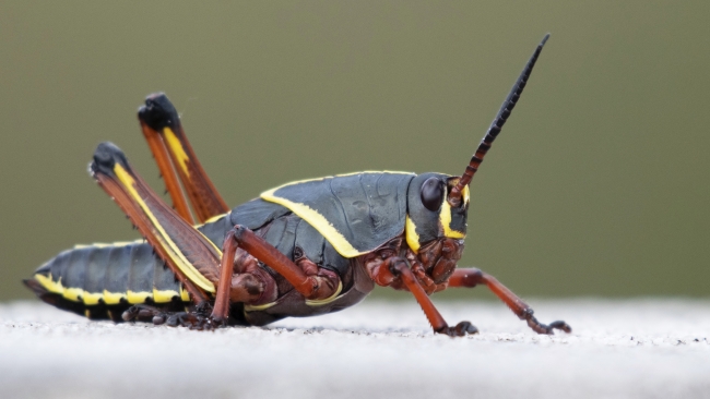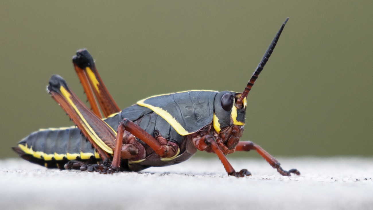 This grasshopper is locally common in swamps, open woodlands, weedy fields, and ditches in the southeastern United States. This species displays bold color patterns that vary from primarily lighter yellows and oranges in eastern portions of its range (although the black form occurs throughout the range) to shiny black with red markings in western portions.