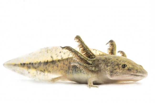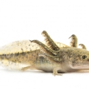 Eastern tiger salamander larvae at Gavins Point National Fish Hatchery in Yukton, South Dakota. In December, adults emerge on rainy nights and migrate to vernal pools to breed. By March, adults return to upland burrows. Eggs hatch in 30 days, larvae remain in pool feeding on zooplankton and invertabrates.