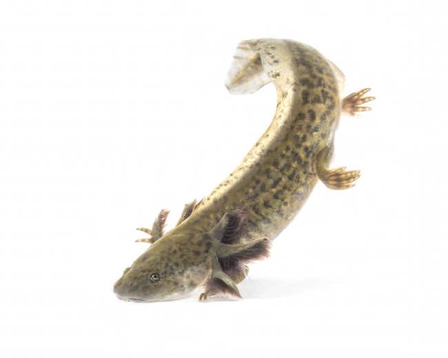Eastern tiger salamander larvae at Gavins Point National Fish Hatchery in Yukton, South Dakota. In December, adults emerge on rainy nights and migrate to vernal pools to breed. By March, adults return to upland burrows. Eggs hatch in 30 days, larvae remain in pool feeding on zooplankton and invertabrates.