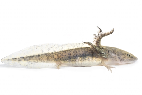 Eastern tiger salamander larvae at Gavins Point National Fish Hatchery in Yukton, South Dakota. In December, adults emerge on rainy nights and migrate to vernal pools to breed. By March, adults return to upland burrows. Eggs hatch in 30 days, larvae remain in pool feeding on zooplankton and invertabrates.