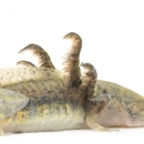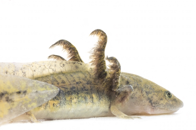 Eastern tiger salamander larvae at Gavins Point National Fish Hatchery in Yukton, South Dakota. In December, adults emerge on rainy nights and migrate to vernal pools to breed. By March, adults return to upland burrows. Eggs hatch in 30 days, larvae remain in pool feeding on zooplankton and invertabrates.