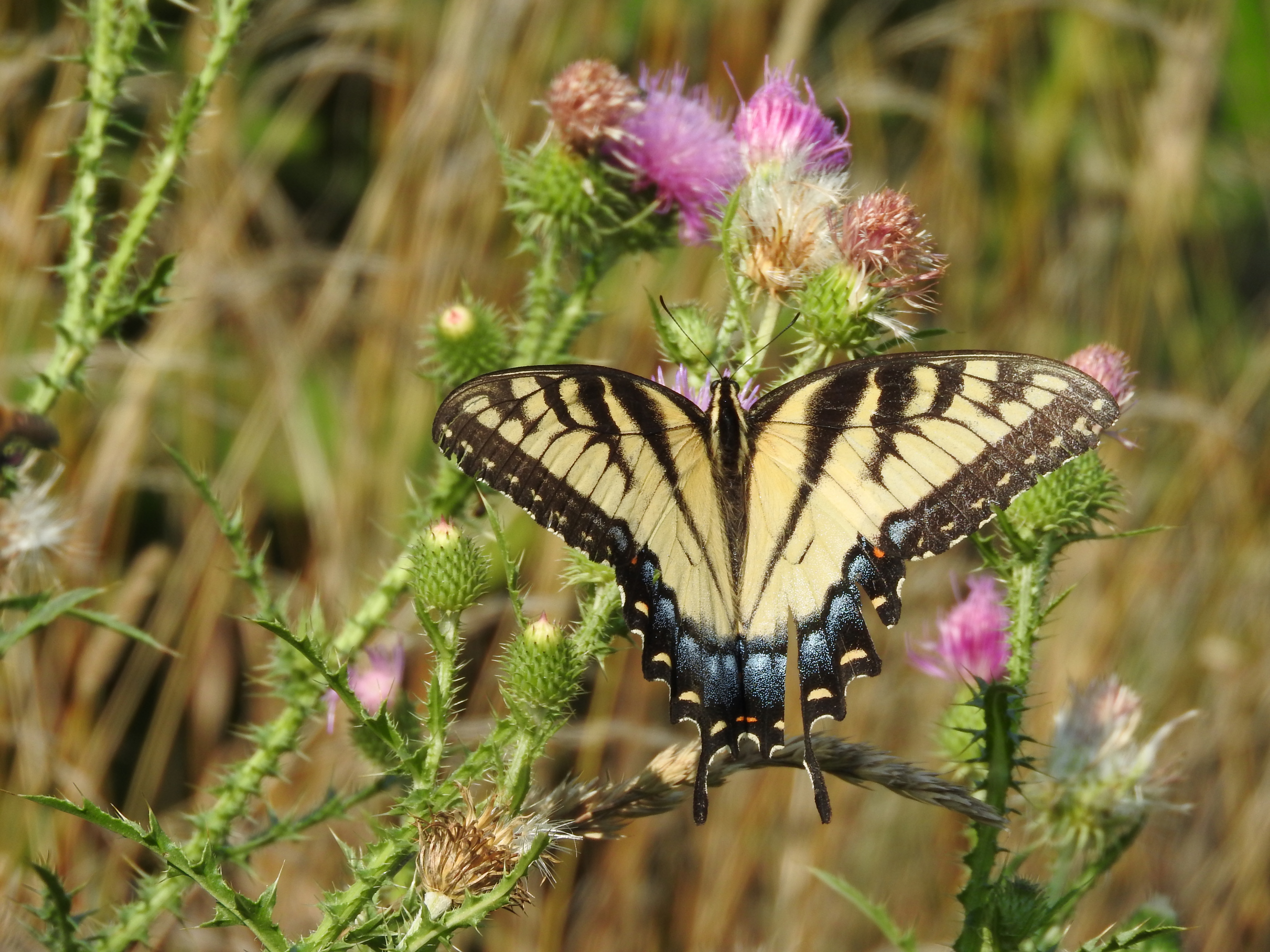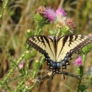 A yellow Eastern tiger swallowtail butterfly on a thistle plant.