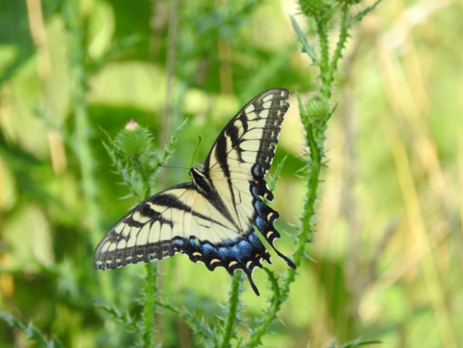 A yellow Eastern tiger swallowtail butterfly rests on a thistle.