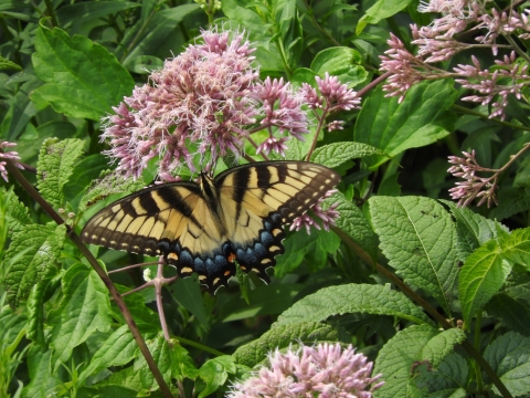 A yellow Eastern tiger swallowtail on Joe-Pye weeds.