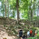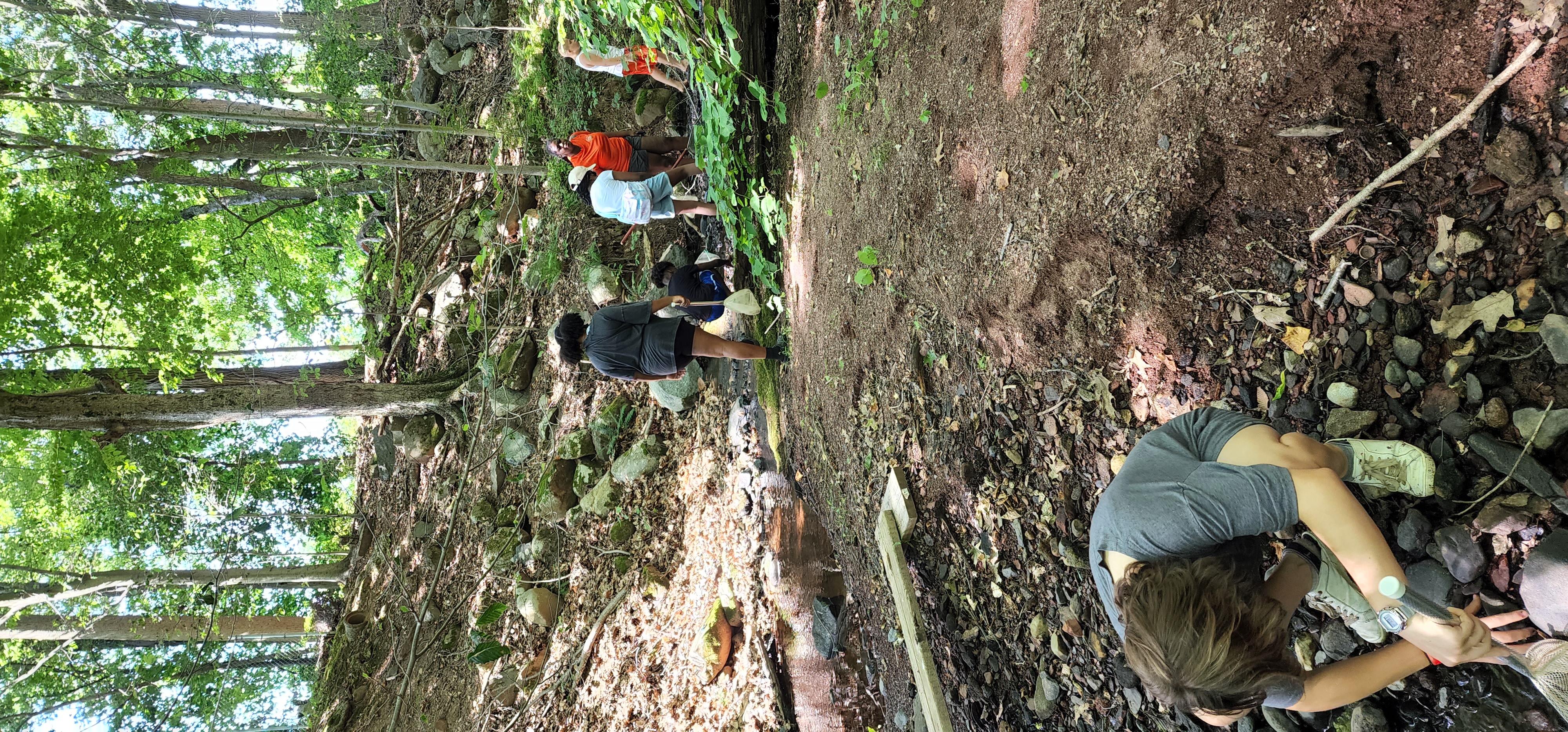 Eco-campers walking along a wooded trail and exploring the woods of New Haven