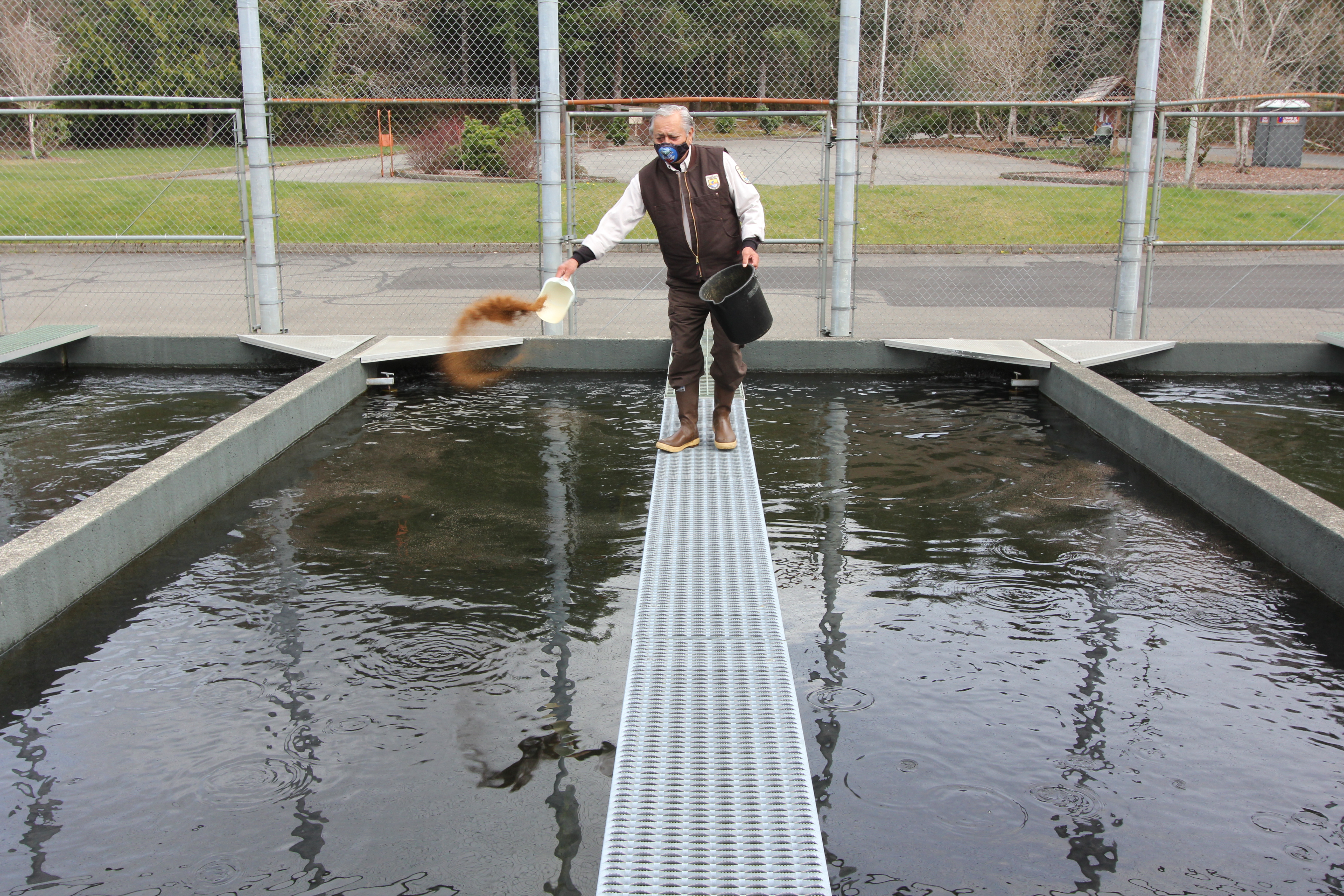 Feeding time! Quinault National Fish Hatchery fish culturist, Ed Lemieux, feeding salmon in the outdoor rearing ponds, or "raceways."