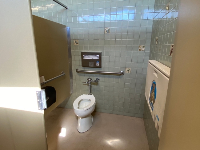 The Education Shelter bathrooms have an accessible stall with grab bars and a baby changing table.