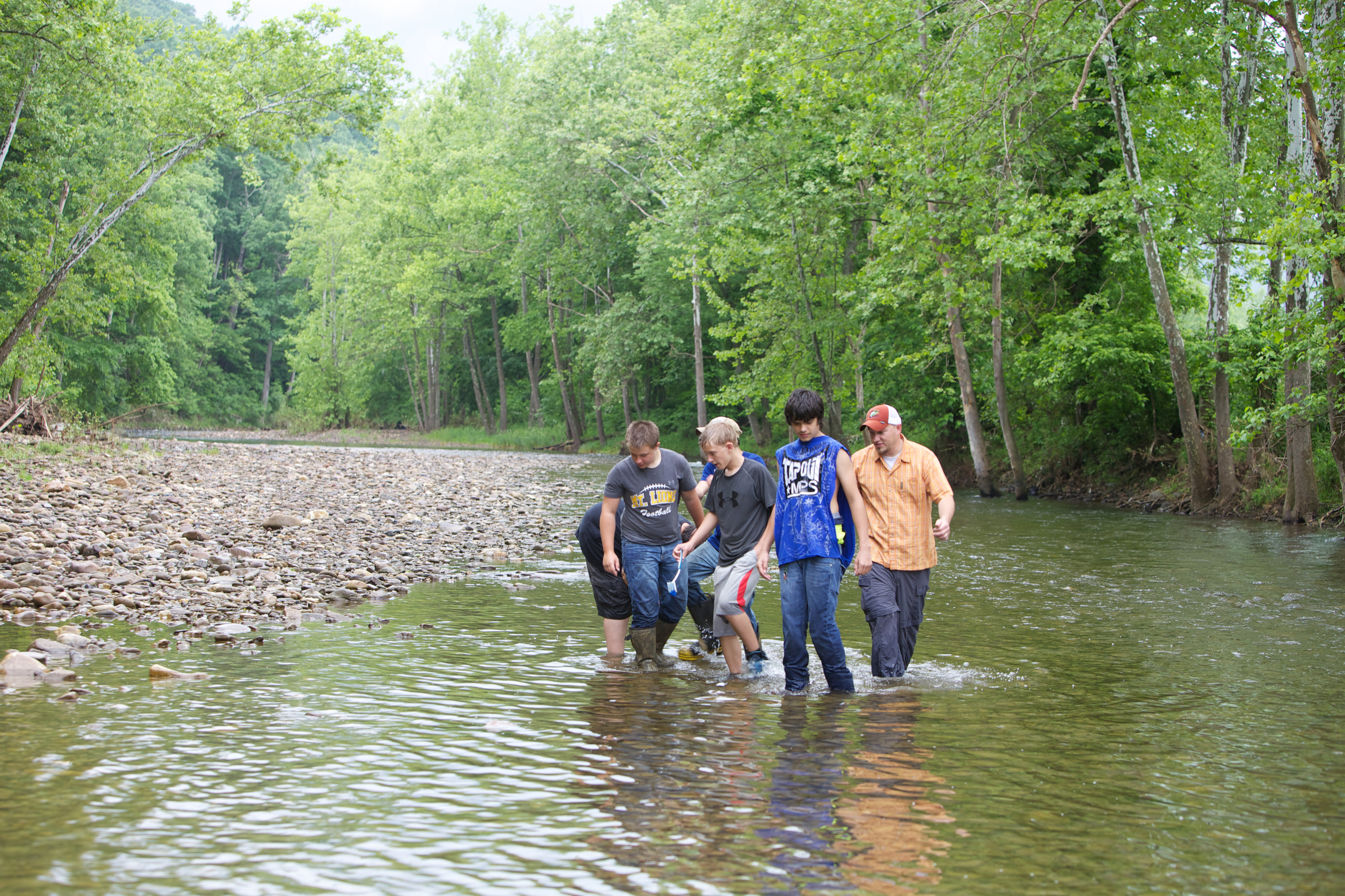 School children test water quality chemistry/survey macroinvertebrates at Seneca Rocks, WV.