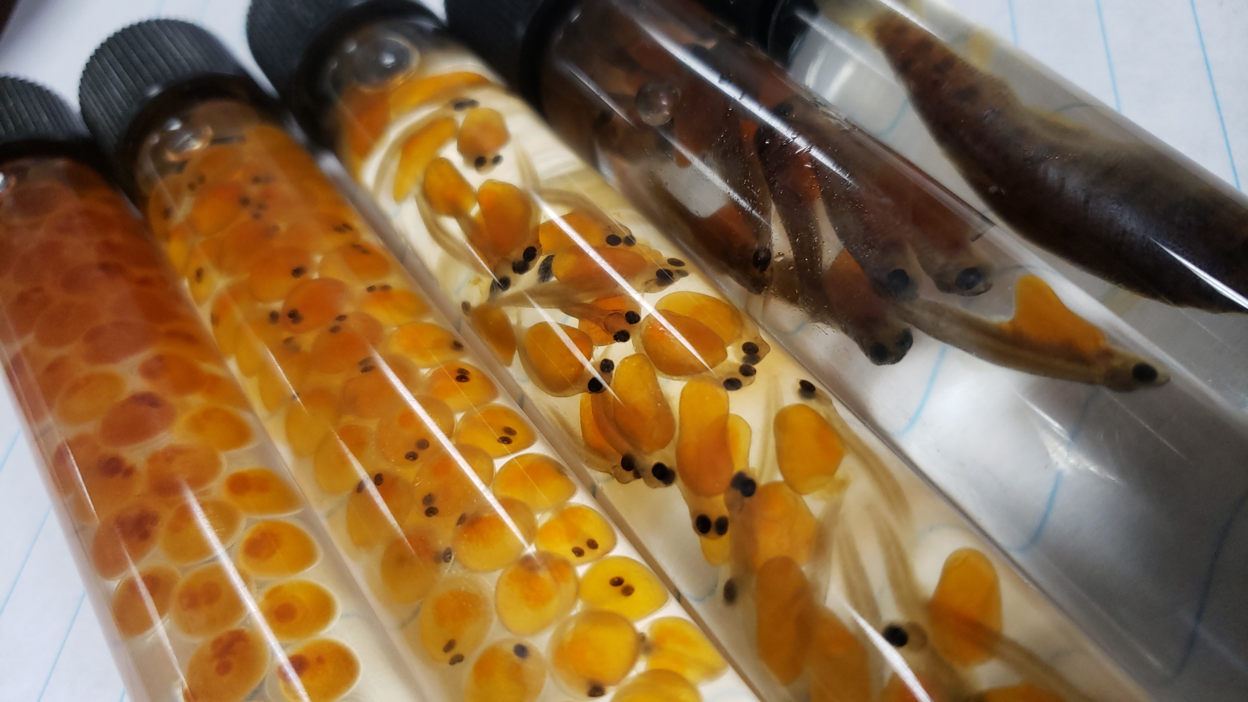 Egg tubes are used during outreach events to show lifecycle stages of a salmon close-up.