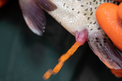 Close up of eggs exiting the oviduct of a rainbow trout. Erwin National Fish Hatchery.