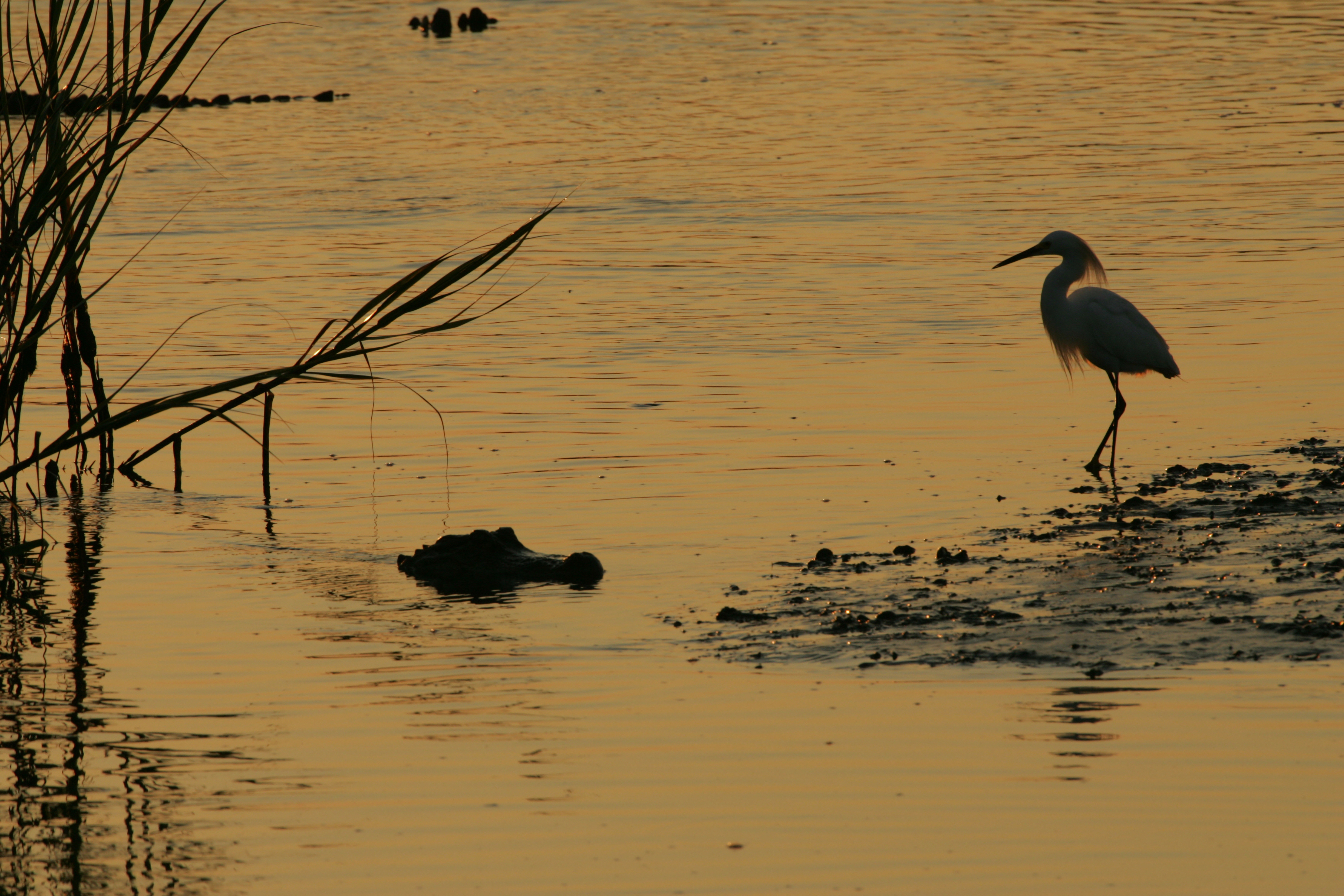 Silhouette of an egret and an American alligator