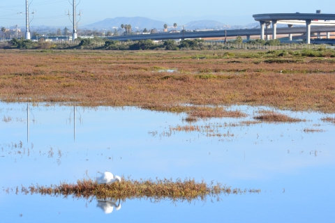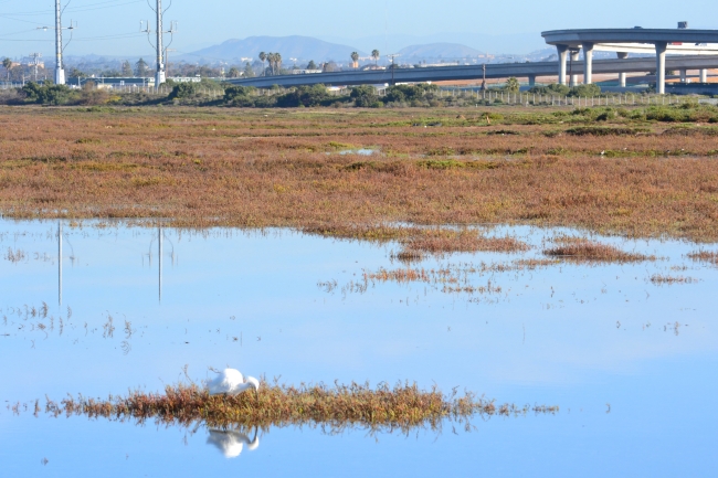 During an extreme high tide event on February 17, 2011 the bay water creeped into Sweetwater Marsh to 6.9 feet! Pictured here is Sweetwater Marsh with HWY 54/Interstate 5 highway connections that border the eastern edge of the highly urban San Diego Bay National Wildlife Refuge