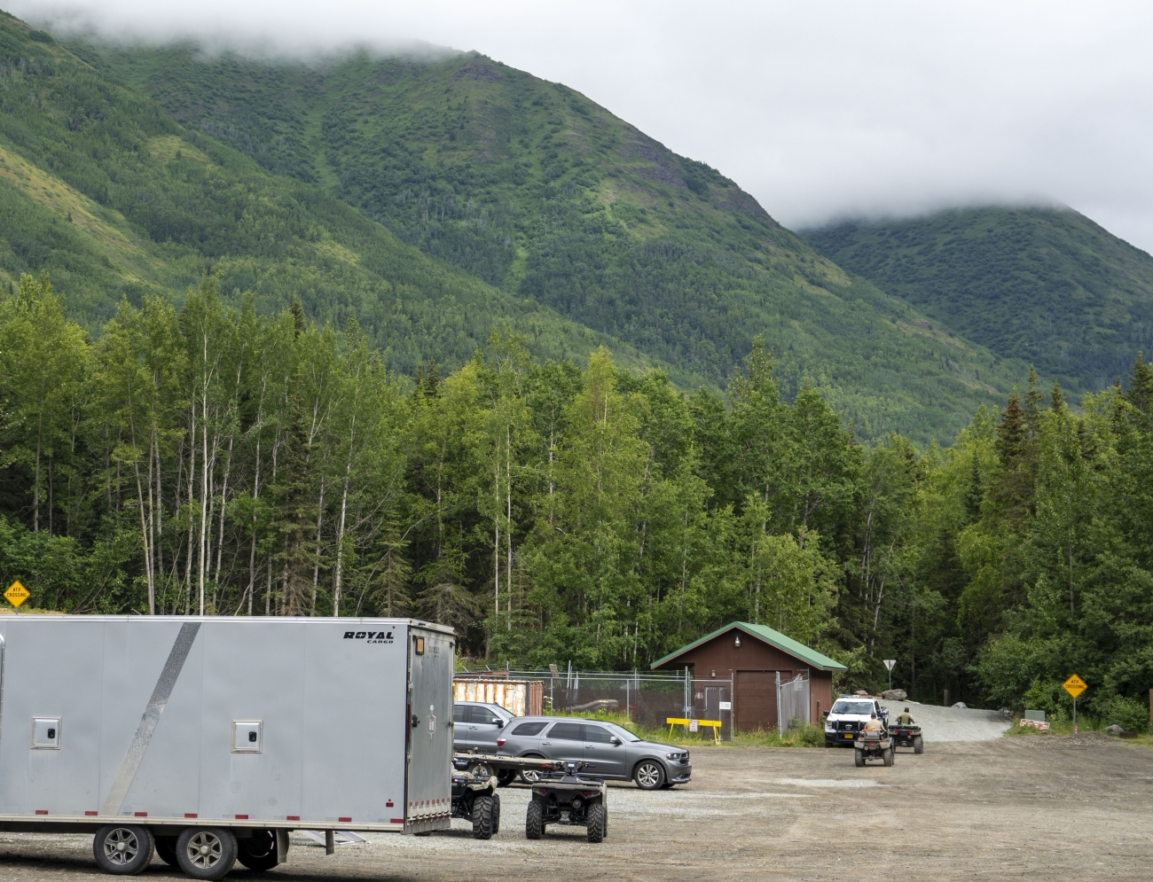 ATV riders near the trail entrance at the Eklutna Lake ATV Trailhead near Anchorage, AK. The trailhead parking lot was expanded in June 2024 to allow increased hunter access to the area. The expanded parking lot was funded by a cooperative effort between the State of Alaska, Eklutna Inc., Eklutna Village Corporation, and the U.S. Fish and Wildlife Service using a combination of Pittman-Robertson Act and state funds.