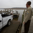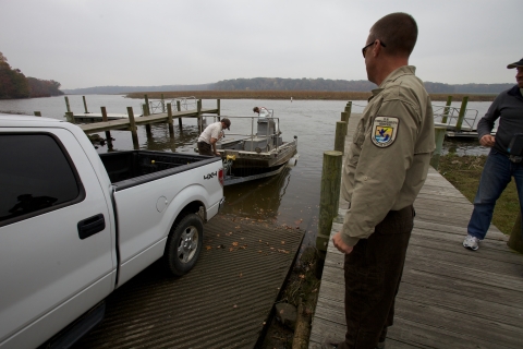 USFWS Biologists electrofish for the invasive Northern Snakehead. Biologist with vehicle, boat and trailer.
