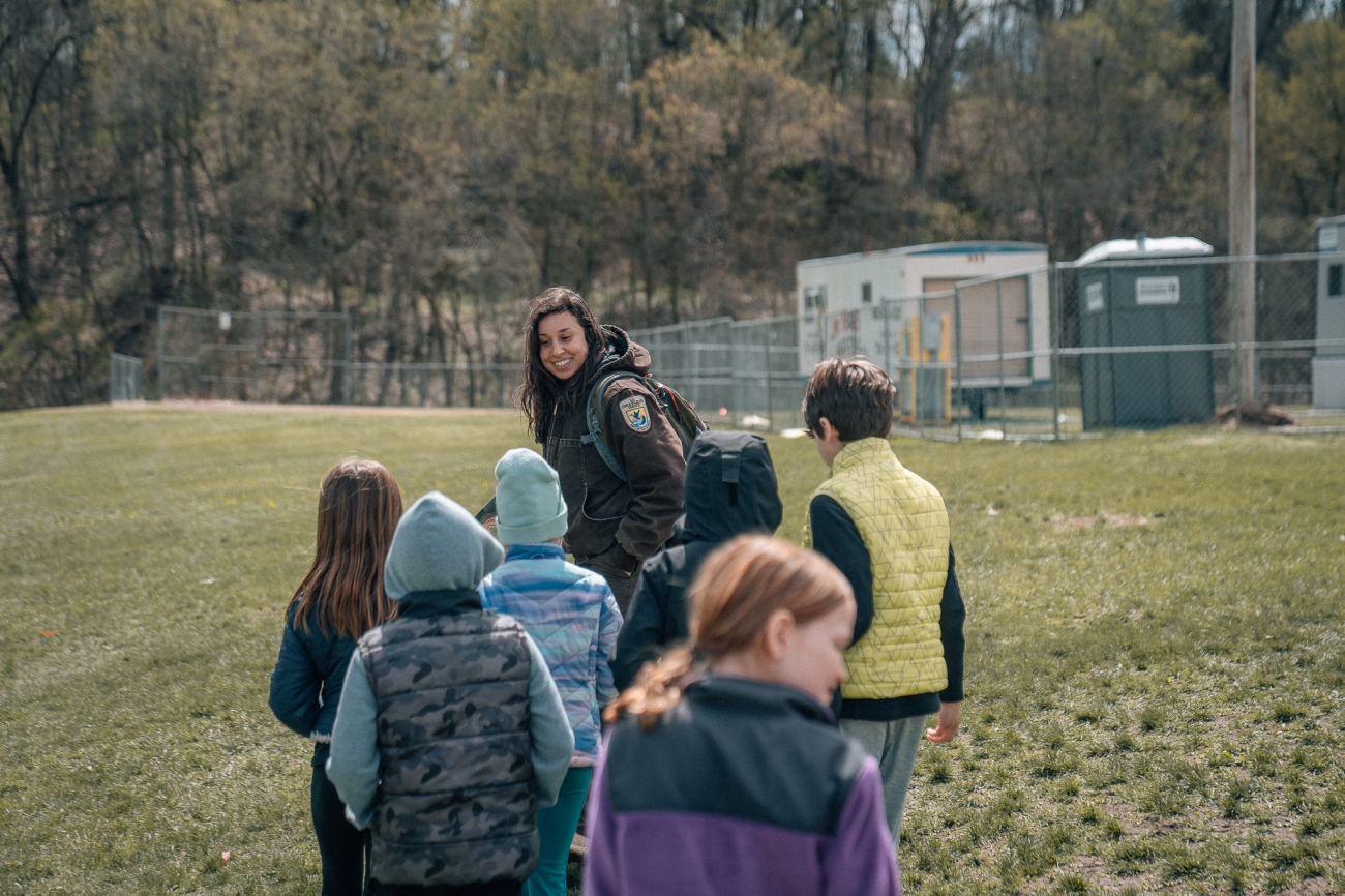 Cristina Dahl leads elementary schoolers to a school forest for an environmental education program.