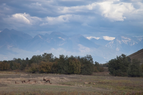 Elk herd with mountain backdrop