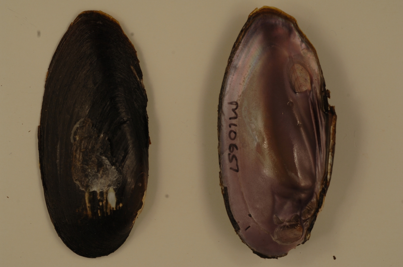 NCTC Freshwater Mussels Teaching Collection: Order: Unionoida Family: Unionidae Genus (ITIS): Elliptio Species: dilatata (inside) Williams et al.: Use to be: Location Name: Muskegon River, Missaukee County Location State: MI