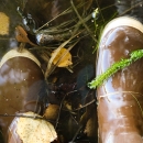 Strand of invasive Elodea on top of boot submerged in water.