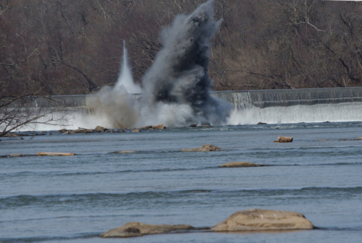 First set of explosives used in the destruction of the Embrey Dam on the Rappahannock River near Fredericksburg, Virginia, to allow migration of the American shad.
