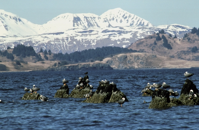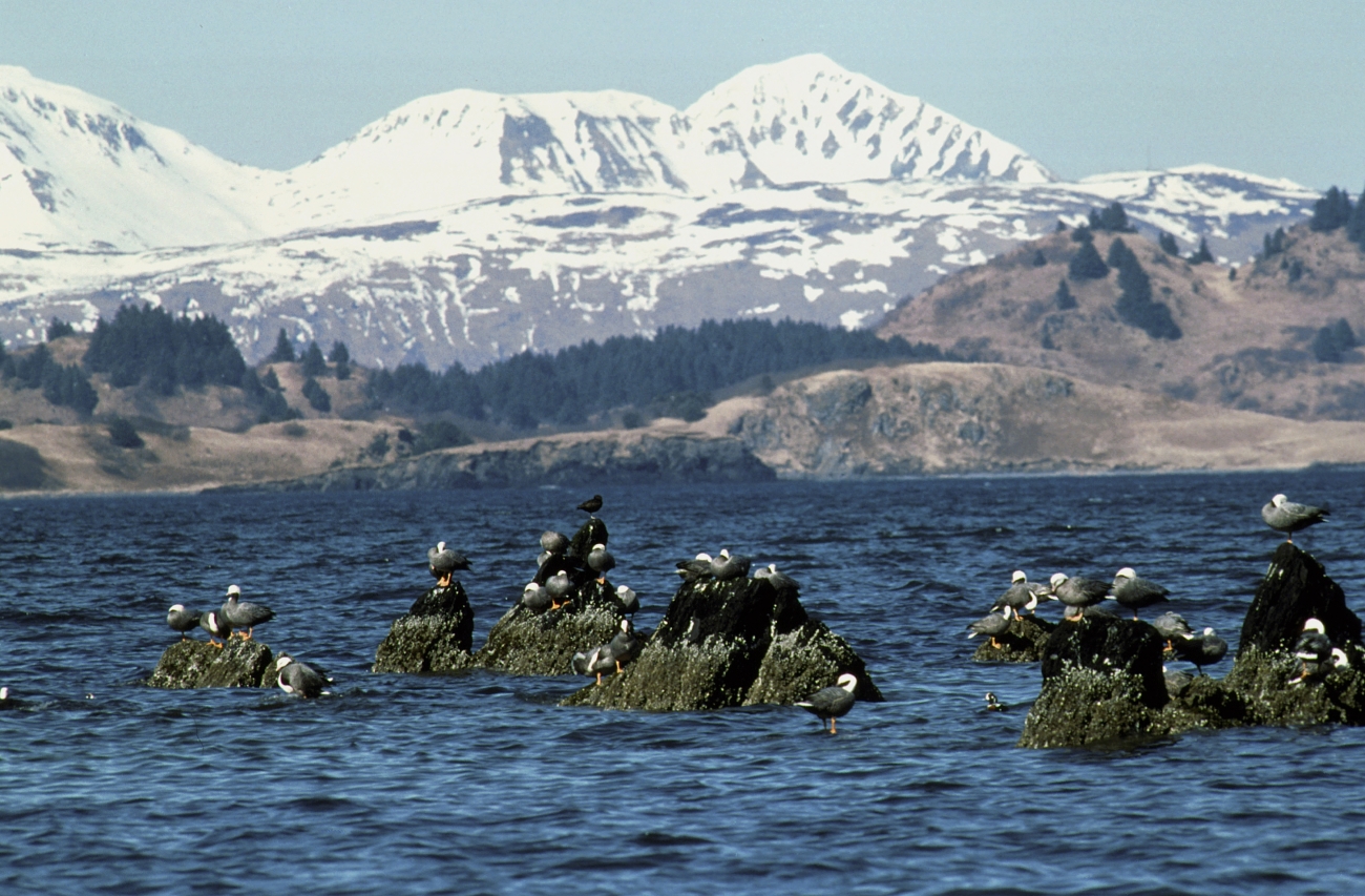 A group of Emperor Geese rest on the peaks of Chiniak Bay rocks in the Kodiak National Wildlife Refuge located in Alaska.