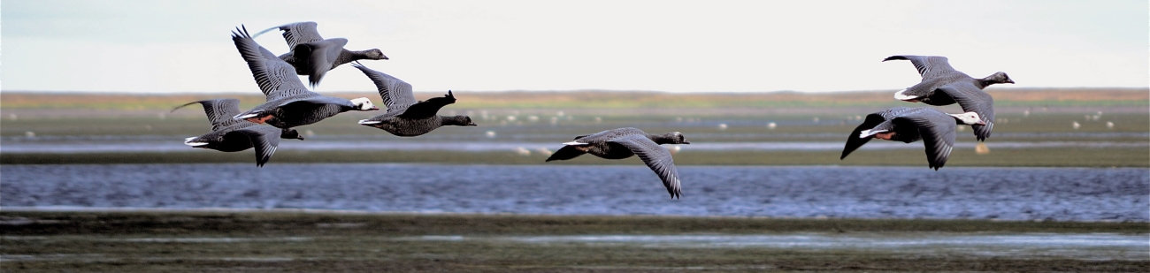 Emperor geese fly over Izembek Lagoon in Alaska.