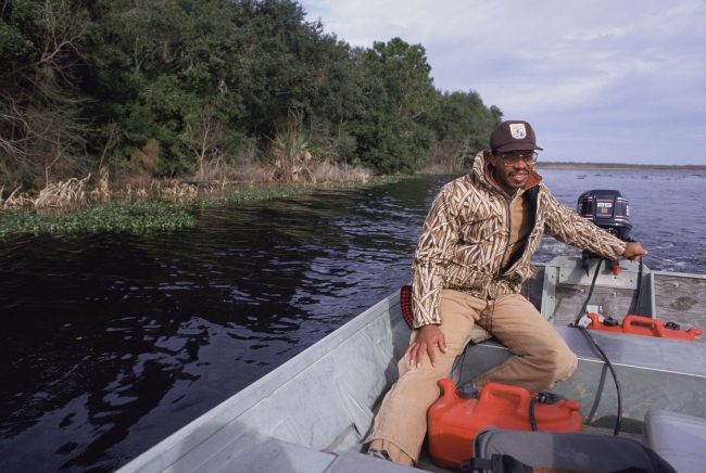 A U.S. Fish and Wildlife Service employee drives a small motor boat in Louisiana.