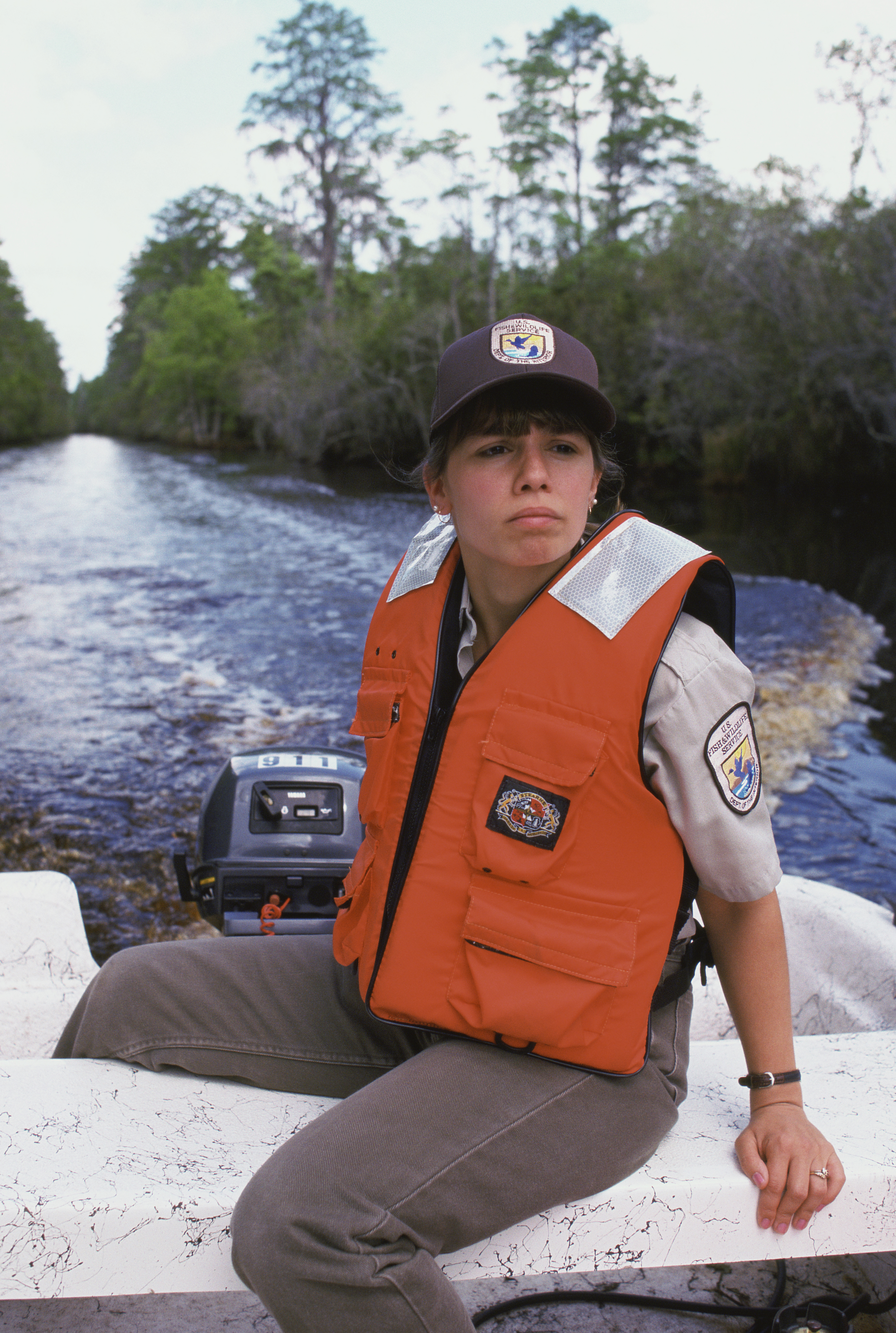A U.S. Fish and Wildlife Service employee drives a small motor boat in the Okefenokee National Wildlife Refuge located in Georgia.