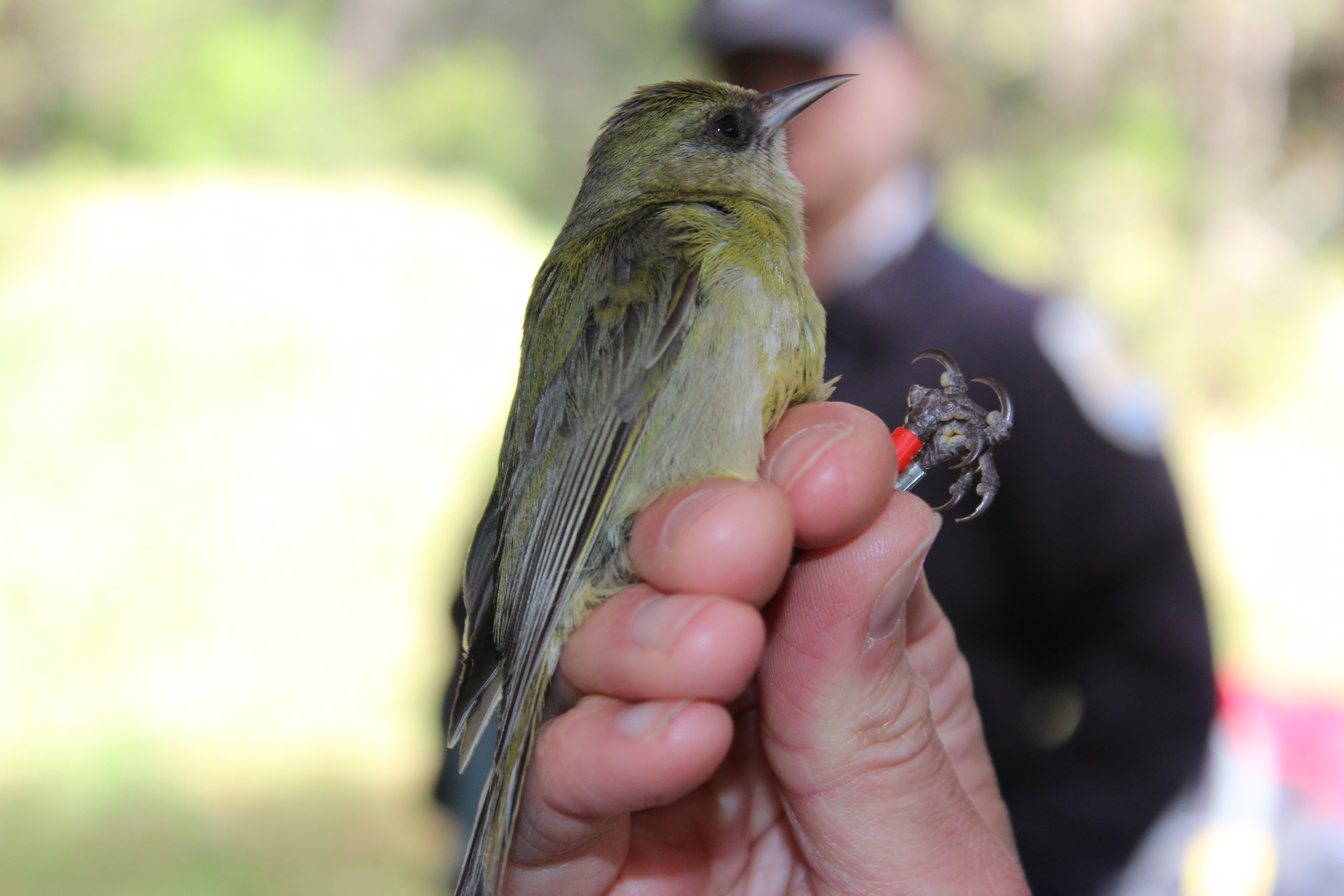 Biologists carefully weigh and measure each bird before banding. Hawai‘i creepers call softly to one another while flitting from tree to tree. Creeping up and down koa and ‘ōhi‘a tree trunks and along the underside of larger branches, they feed on insects living under the loose bark.