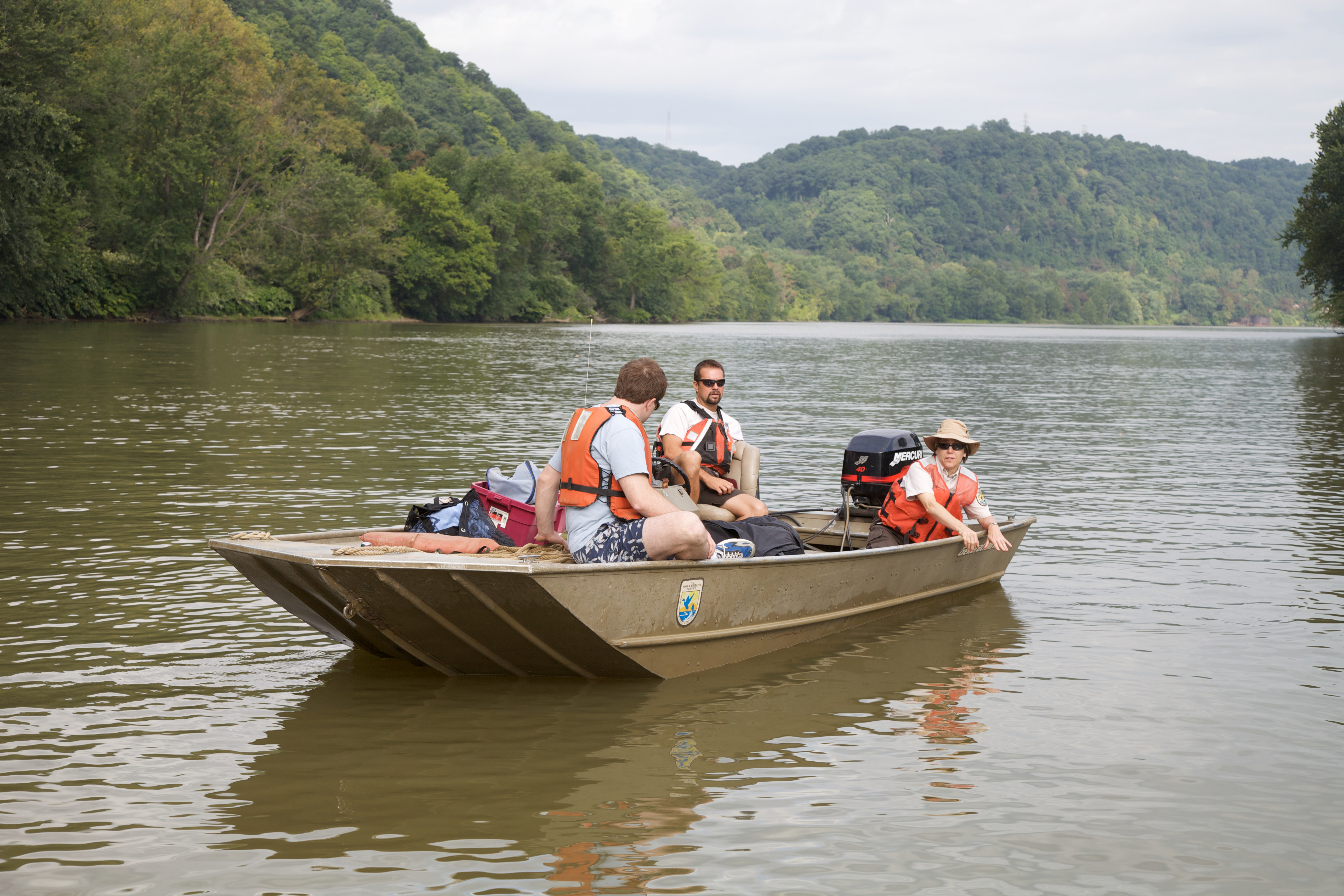 Ohio River Islands National Wildlife Refuge personnel in a boat on the Ohio River.