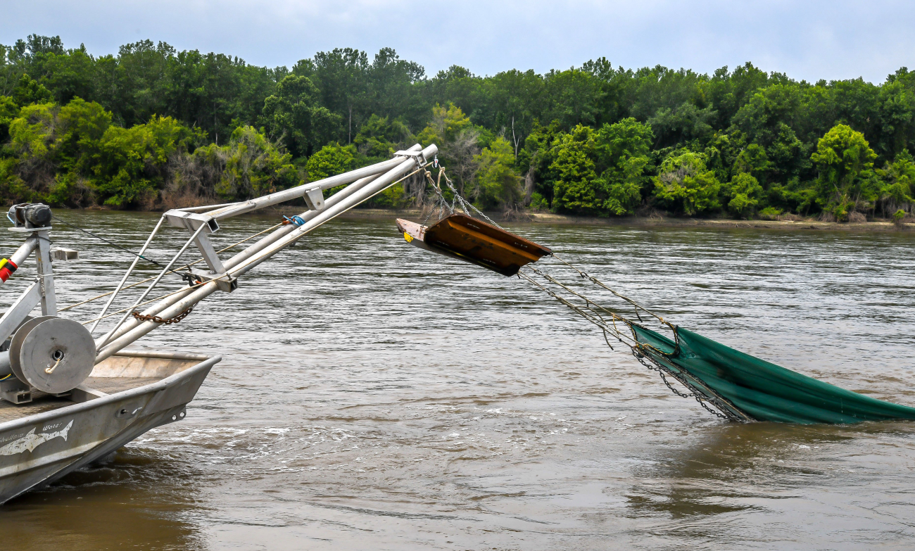 At the end of the sampling transect, the mechanical booms are being raised thereby lifting the trawl.