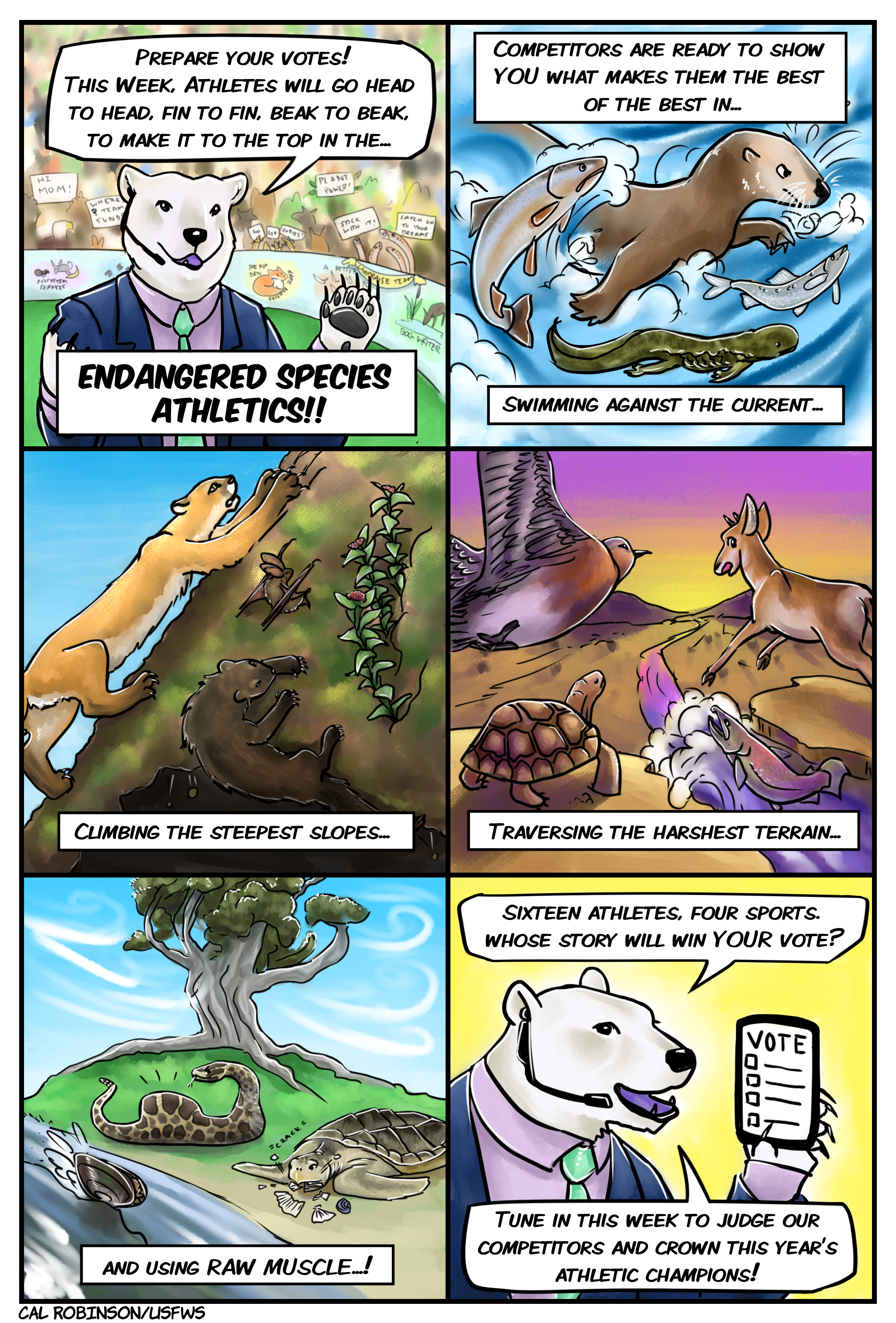 Panel 1 shows a polar bear wearing a suit looking like a sports commentator saying, “Prepare your Votes! This week, athletes will go head-to-head, fin-to-fin, beak-to-beak to make it to the top in the Endangered Species Athletics!”