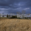 View from across a field of dried grasses of the Entry Building at the National Conservation Training Center.