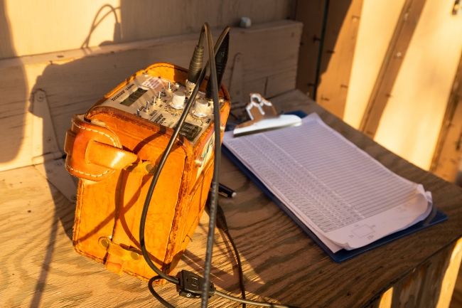 Each trap door has a transmitter that changes signal depending on if the door is up or down. With many miles of trapline, biologists listen for each transmitter throughout the day to find out which traps may be active. Lynx Project At Yukon Flats National Wildlife Refuge.