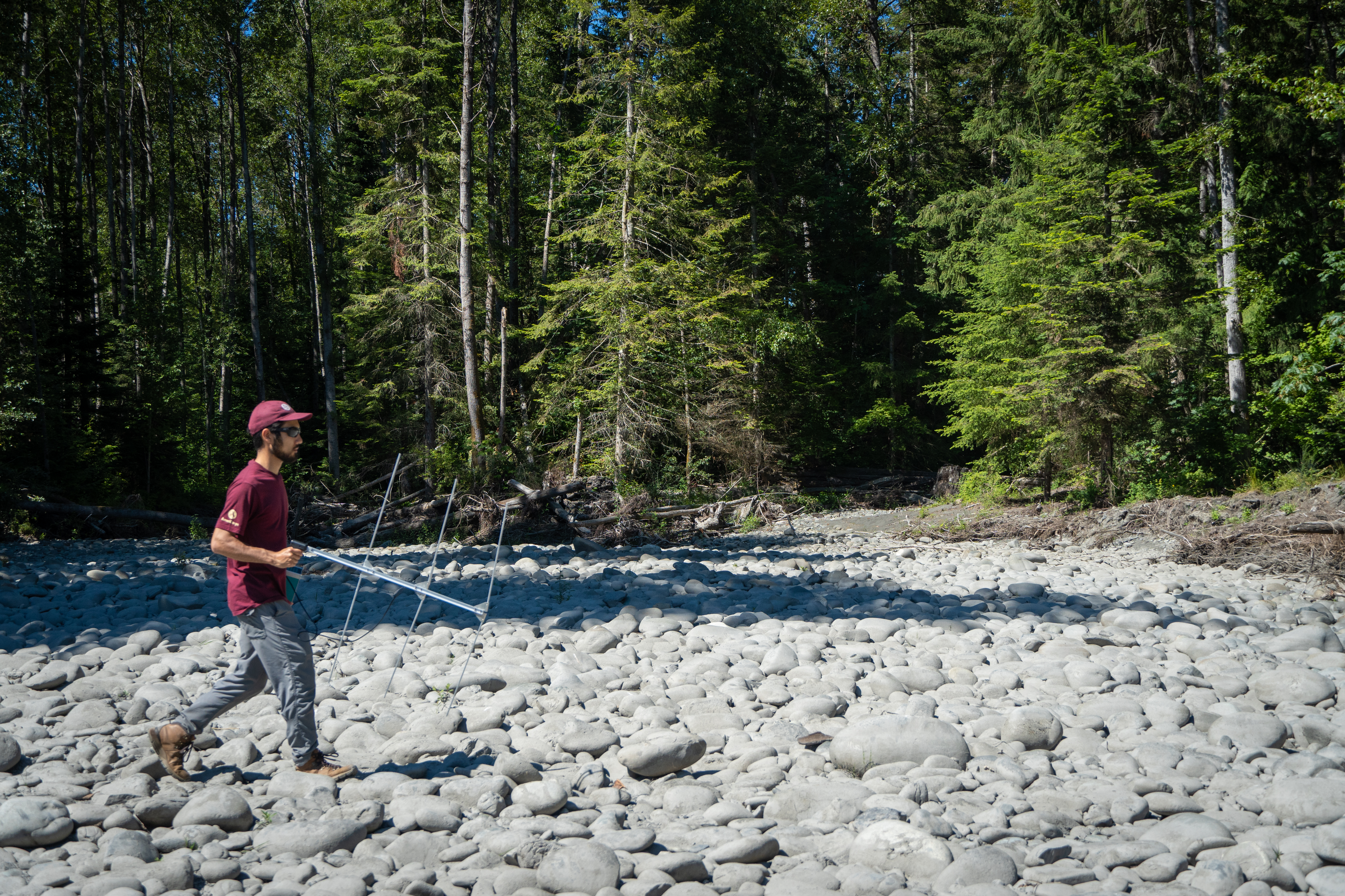 Service intern, Eric Klingberg, walking along the Elwha River in search of radio tagged salmon.